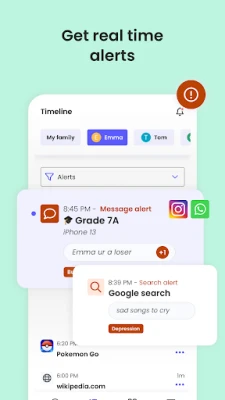 - AI-powered message and search alerts: Monitors and alerts for any suspicious browsing activity, or harmful SMS and social messages.